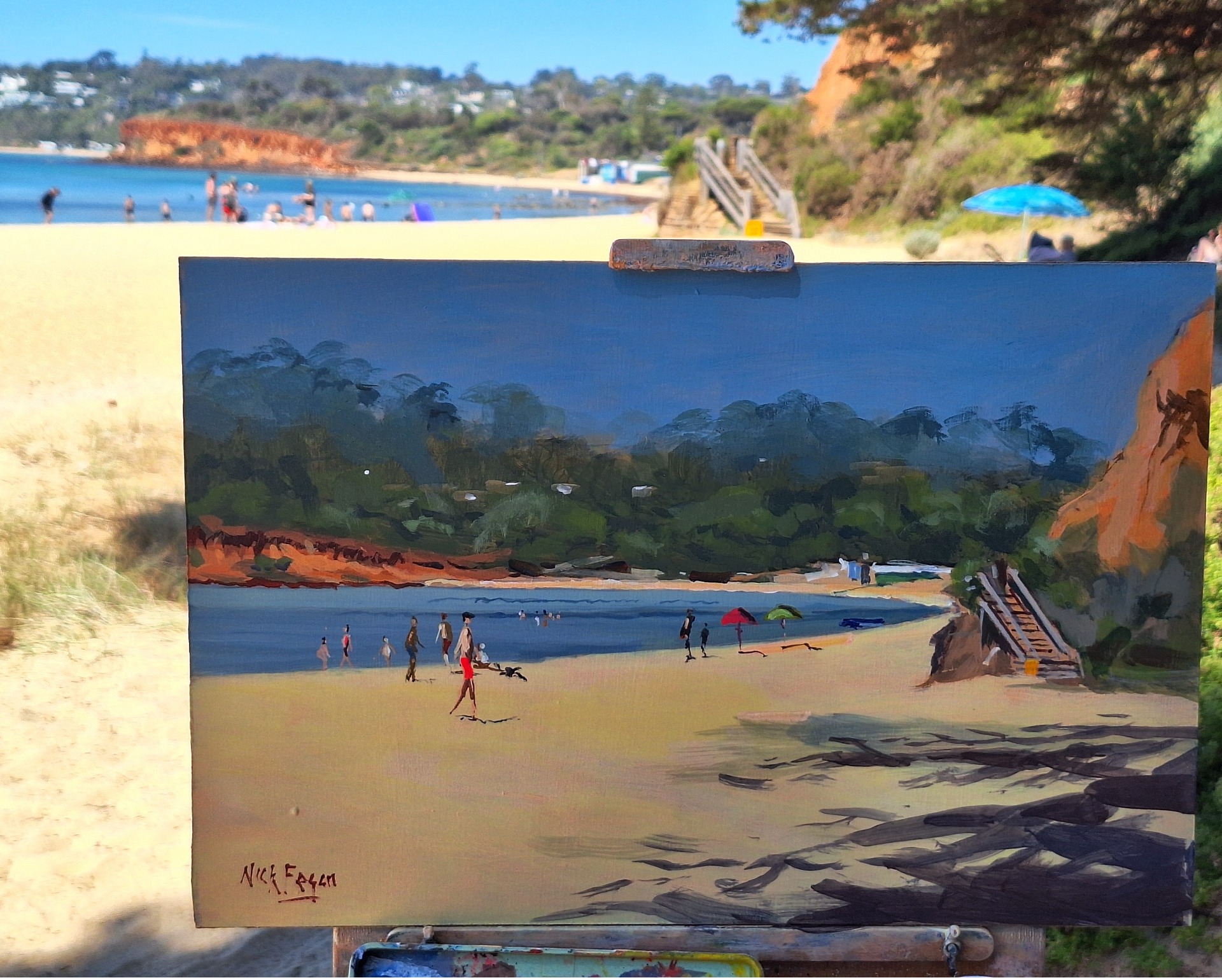 During my recent trip to Australia, I discovered a stunning location to paint: Mornington Beach, located on Melbourne's peninsula. It was a vibrant beach filled with tourists and locals enjoying the summer sun. The sand was dazzling! The deep shadows and the red cliff tops provided a beautiful complementary touch to my artwork.