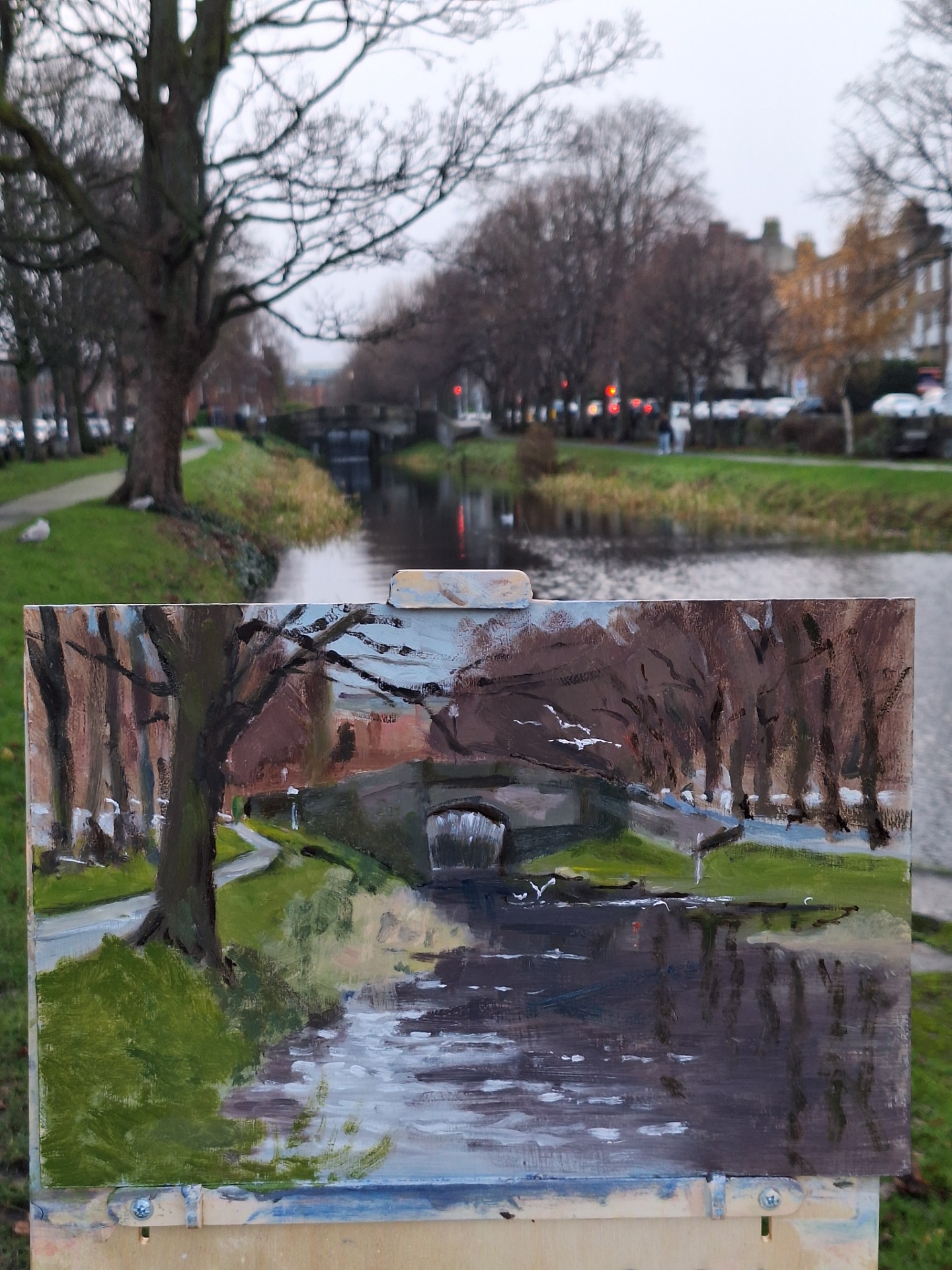 A cold and damp morning with the crisp air of winter on the horizon. The dark rustic colours of the trees and cool greens from the banks inspired me to this graceful bridge on the Grand Canal. Dublin