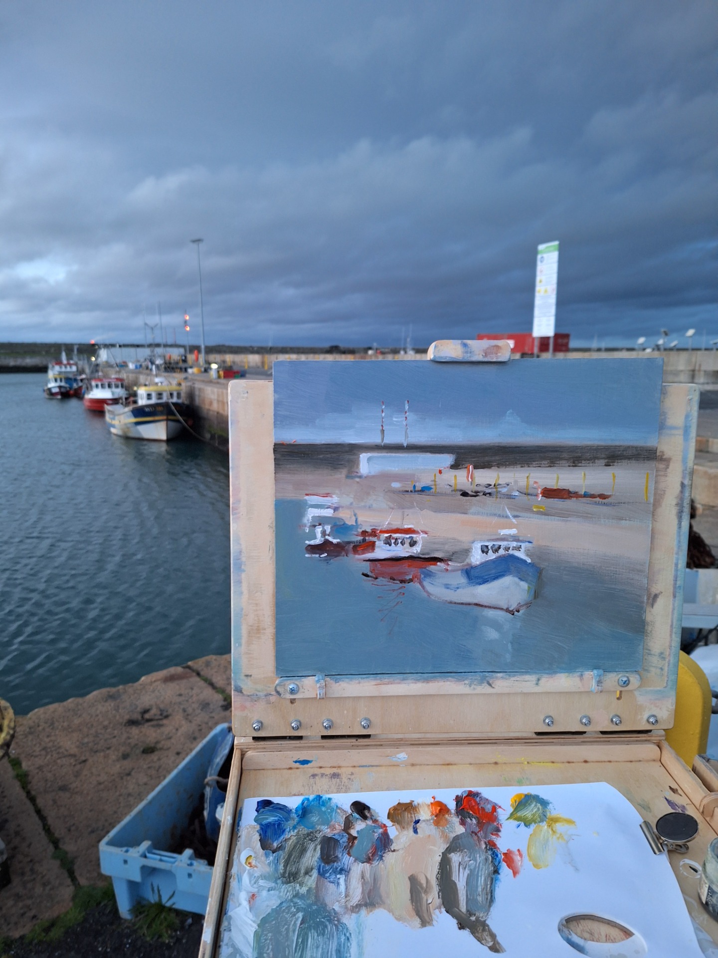 Incoming, painted on site on a beautiful autumn afternoon. I wanted to capture the lovely colours of the vessels. What caught my attention from the start was the threatening sky; the dark, contrasting sky against the lighter green hue of the water made for a thoughtful composition.