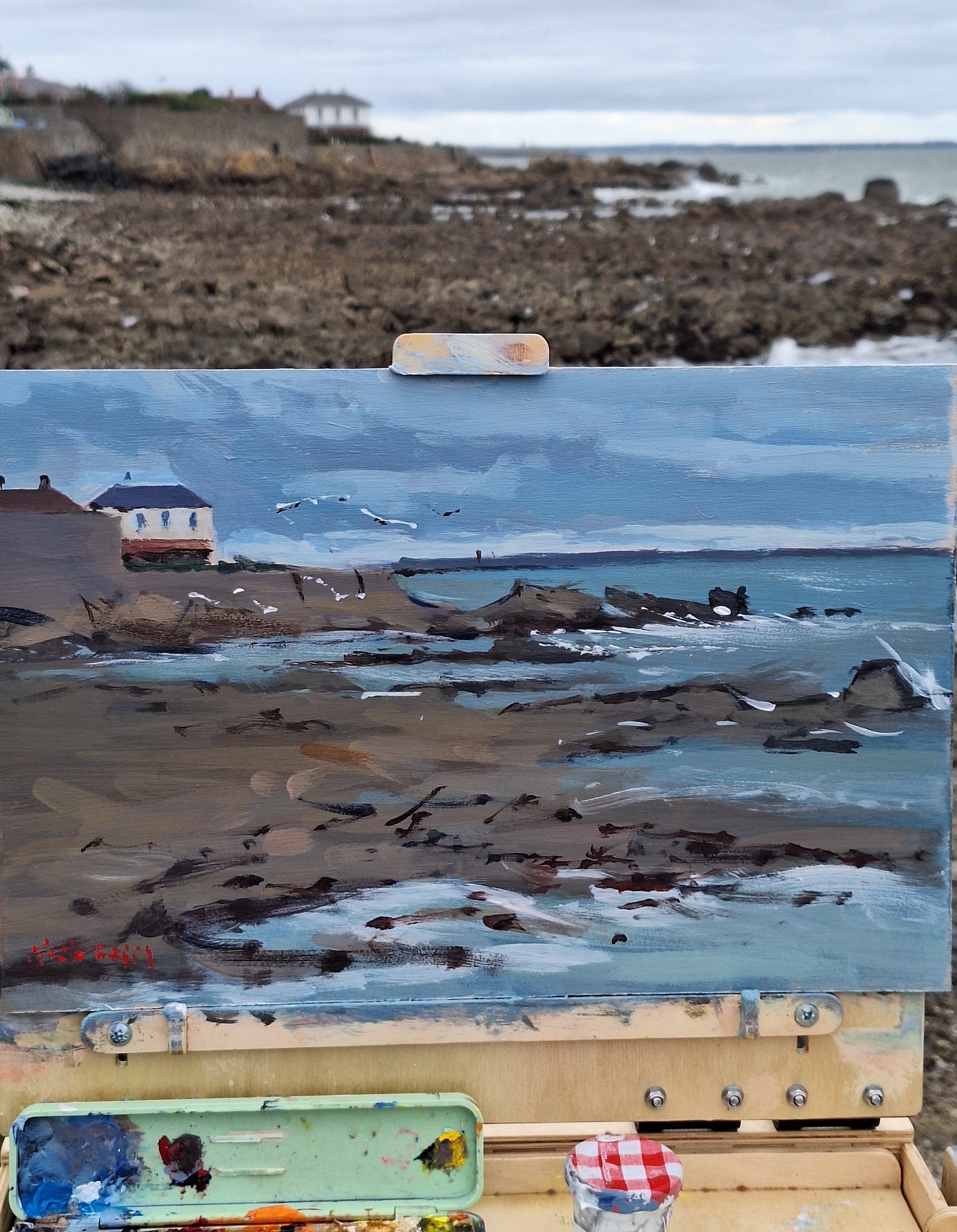 I love painting in harsh weather conditions; here is no exception at this cosy little inlet called Bullock Harbour. It was windy and bitterly cold. This gave me a real impetus to paint quickly and emotionally. I was taken in by the number of gulls along the shore and around the rocks. The strong current whipped up the surf, having a greater impact on the painting.